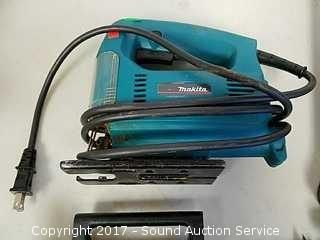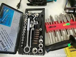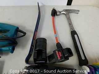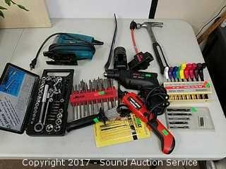 Includes Makita Scroll saw, Skil 3/8" drill, hex key set, drill bits, hammers, and more.