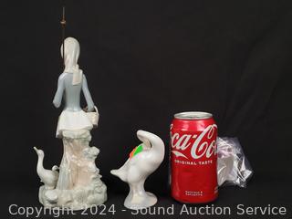 Girl with umbrella (umbrella is broken, comes with pieces, believe it's all the pieces, I didn't realize it was just set on there) & geese, single goose. Approx. 4.25" to 11" tall. Don't see any other issues.