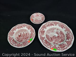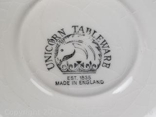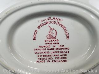 Wedgwood includes "Royal Homes of Britain" & "Woodlands" patterns. 12?pc are Wedgwood, 19pc are Unicorn tableware. 3 Tier server is missing pillar support & largest plate is chipped. Refer to photos for more details.