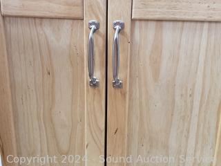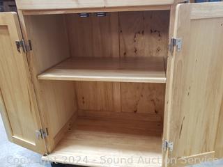Single drawer with roller drawer guides, lower cabinet with shelf, towel bar/handle for moving. Some wear to the finish, appears to be solid wood. 33" x 29" x 18", measurement includes the towel bar/handle.