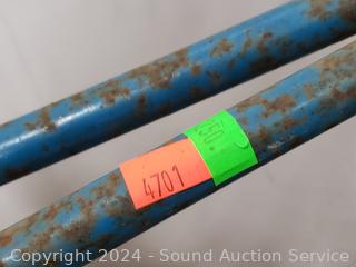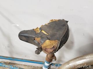 Front tire is flat, other appears to be holding air. Otherwise appears to be functioning as intended. Various weathering, rust, wear to finish, damage to seat.