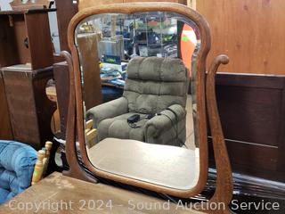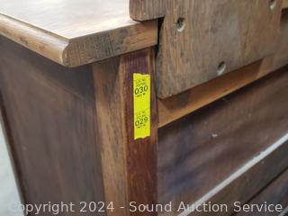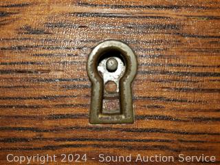 Skeleton key lock, does not come with key. Appears to be solid wood construction, dovetail joinery, beveled mirror. Some wear to the finish. 72" x 42" x 19.5" overall.