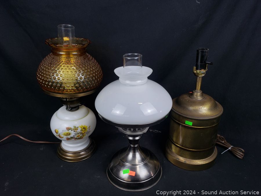 Electric lamps appear to be functioning as intended. 1 is missing harp & shade. Oil lamp is untested. One missing the harp has some rust spotting, others don't see any major issues. Approx. up to 17" tall.