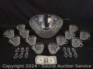 Punch bowl, ladle and 12 cups. Comes with original box, don't see any issues.
