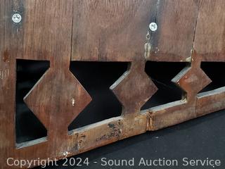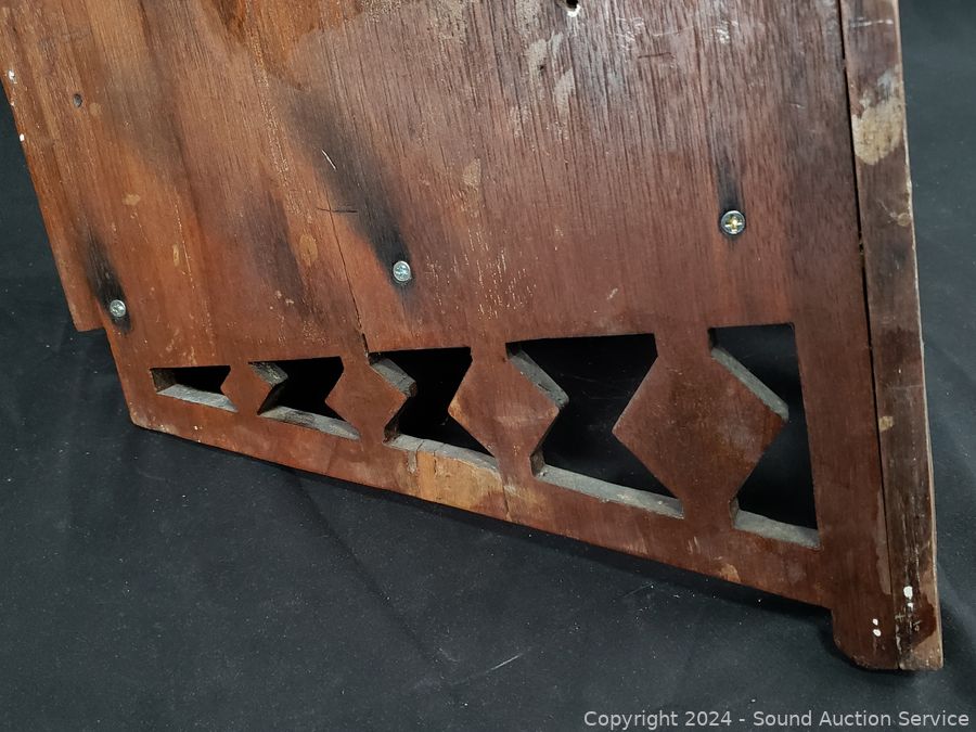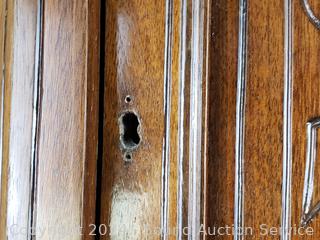 Some wear to the finish, comes with a shelf but no pegs. Skeleton key lock has been removed. 27" x 16" x 14".