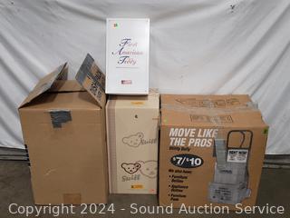 307 Lots including Gray Fabric Pullout Hide-A-Bed Sofa, Antique Dark Finish Oak Ornate Dutch Cupboard, Thomasville Founders Burl Elm Wood Hutch & Dining Table, 1937 Original Kammerer Black Forest Cuckoo Clock, Antique Coal Scuttle, Handcrafted Amish Style Cherry Wood Cradle w/Storage, Aladdin Brass Oil Lamp, Antique Oak Drop Front Writing Desk, Antique Coal Iron, Duncan Phyfe Mahogany Dining Table, Michael Ricker Signed/Numbered Pewter Sculptures, David Winter Cottages, Commodore Computers, "N" Scale Trains/Track/Accessories, Pink Glassware, Fine China Dish Sets, Music CD's, Records, Electronics & Much More!!!