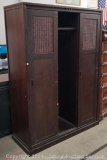 76.5" H x 54.5" W x 21.25" D. Various scuffs, wear to finish, one door not sliding very well.