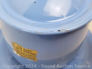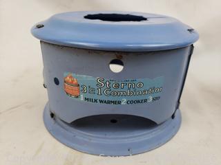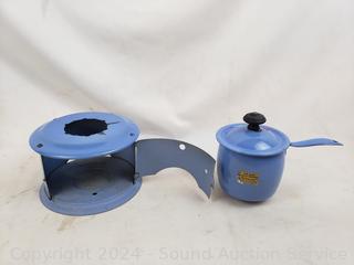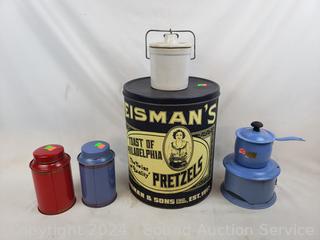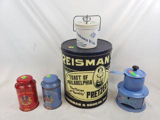 Lot #0033: Enamelware Sterno Stove, Tins & Crock