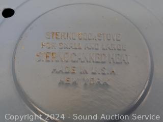 12" x 10" and 7" x 4" tins, 6" x 4" crock, 8" x 6" Sterno stove (door not staying latched shut).