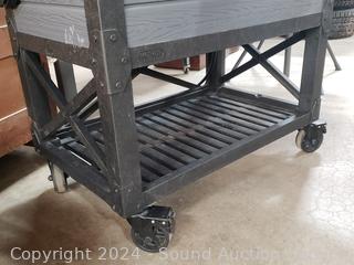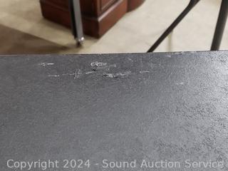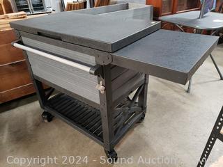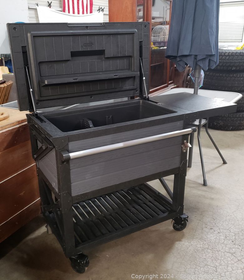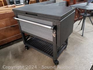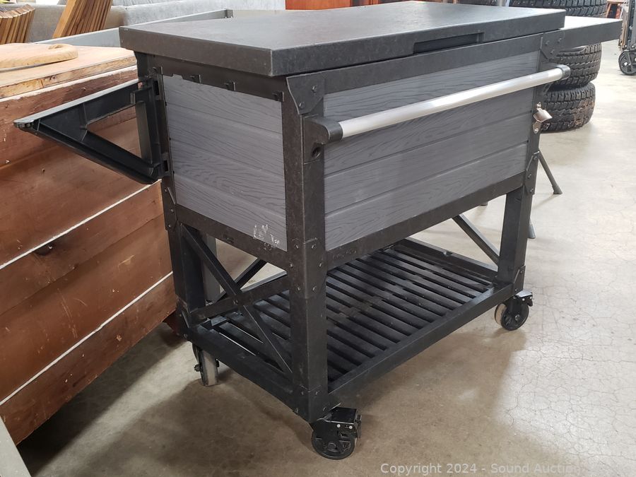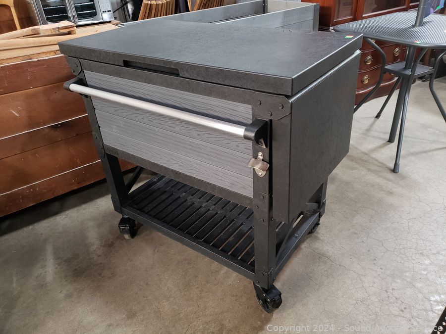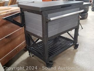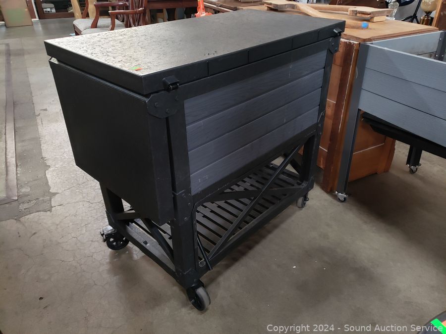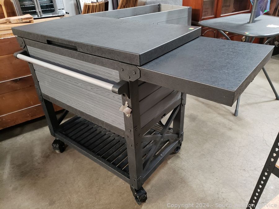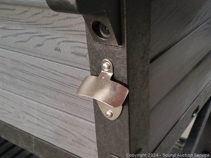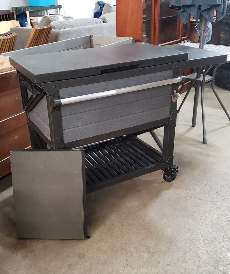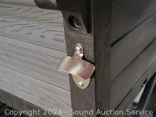 Drop leaf extensions on both sides, one has broken off at the brackets, comes with piece. Built in bottle opener on the side. 35.5" H x 37.5" W x 19.5" D with 15" x 19" leaves. Some scuffs in finish.