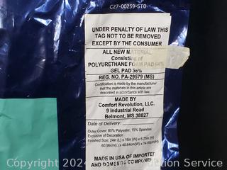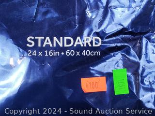 16" x 24". Removable cover. Foam inside has a tear, don't see any other issues.