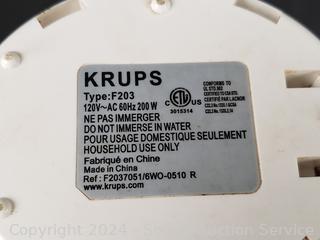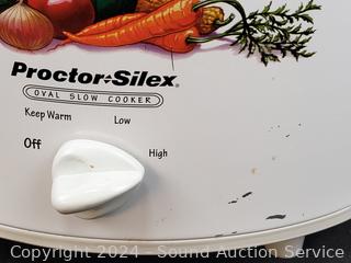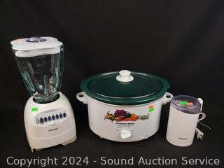 Proctor Silex slow cooker, Krups coffee grinder and Osterizer blender. All appear to be functioning as intended.