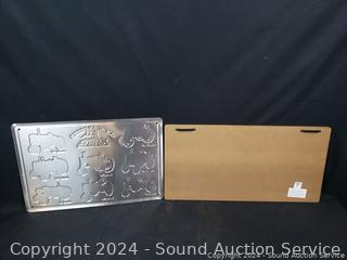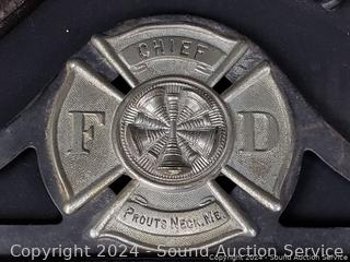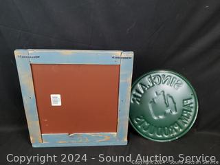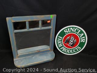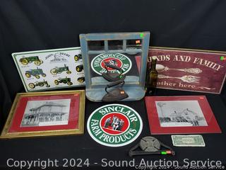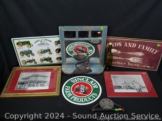 J.Smart Sad iron, "Friends & Family" sign 11" x 22", John Deere tin sign 12" x 18", Sinclair Farms tin sign, mirrored shelf 15" x 14.5", Fire Dept. Chief plaque.