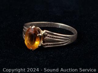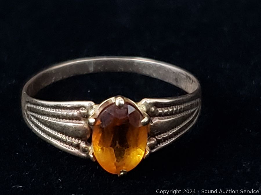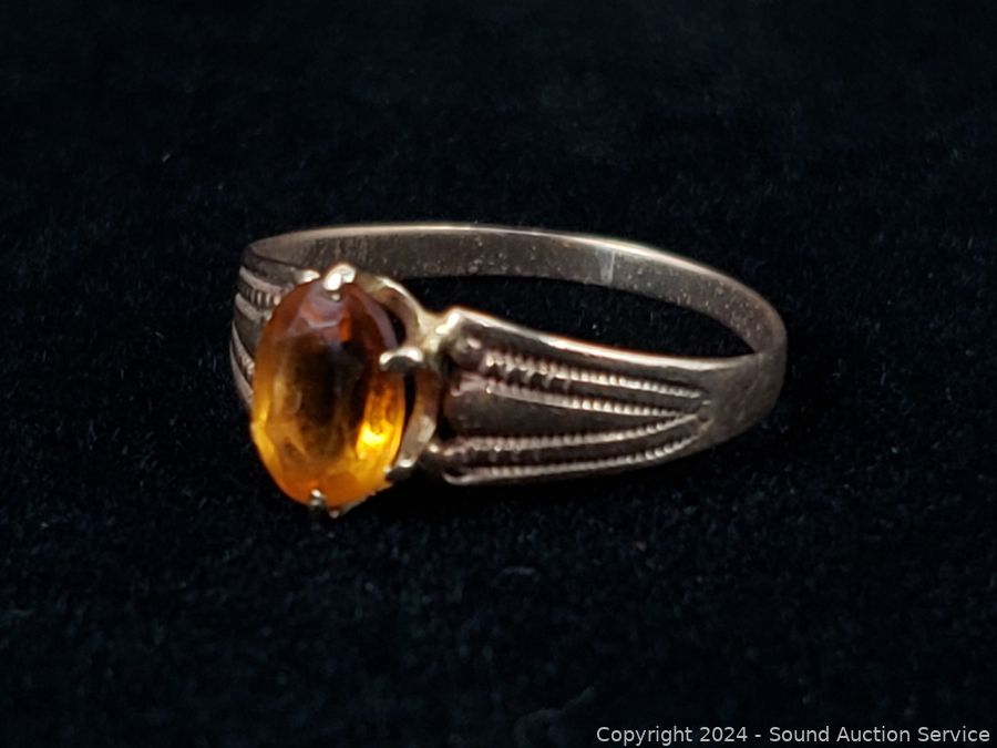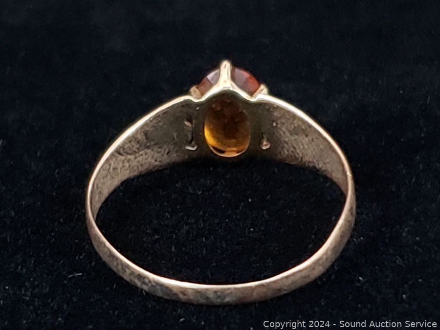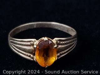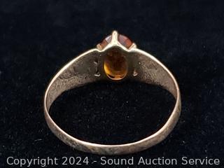 Unmarked, or mark is worn. Held on 10K acid test. Stone tested citrine, band is a little bent. TW:1.07g.