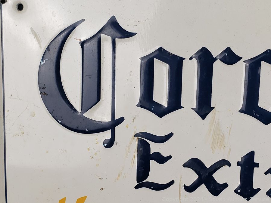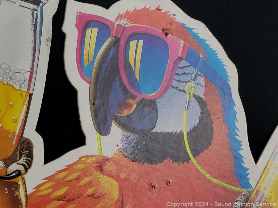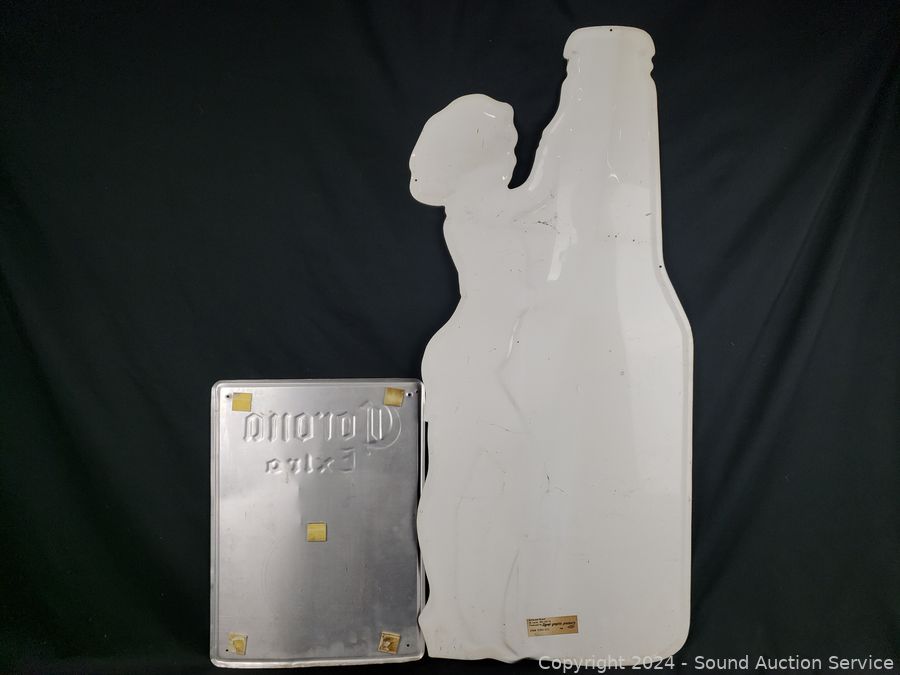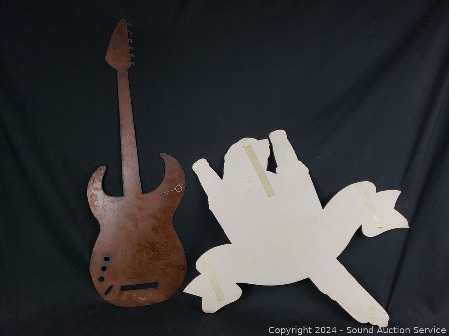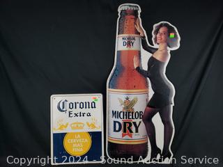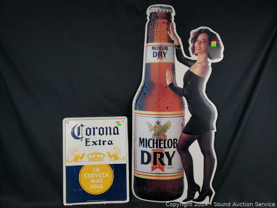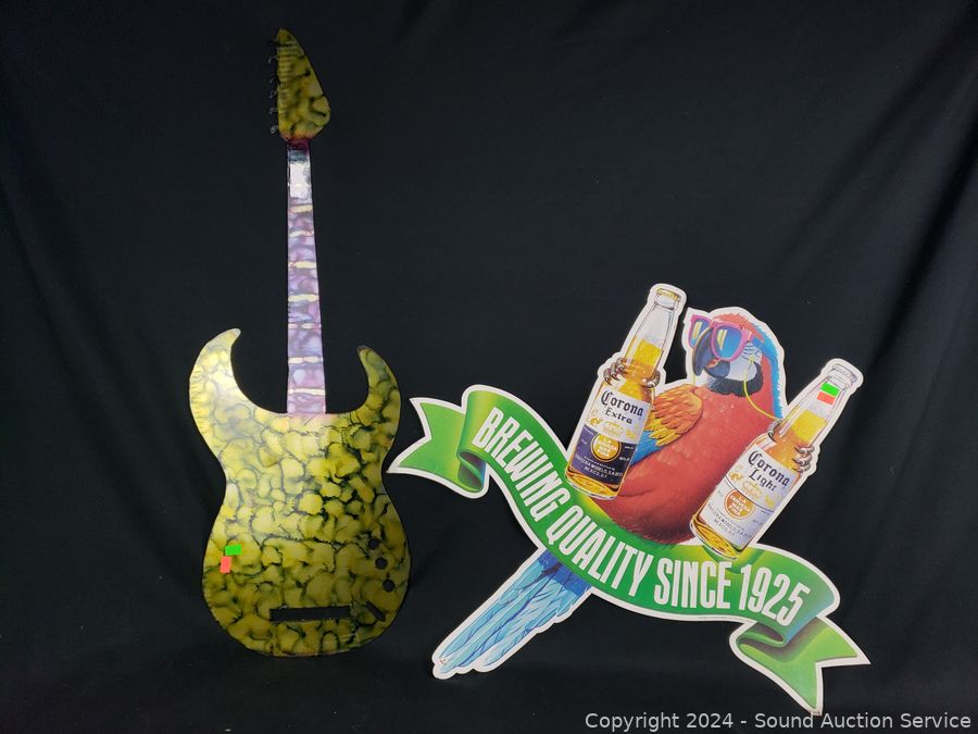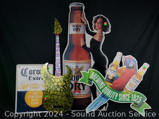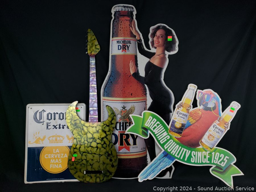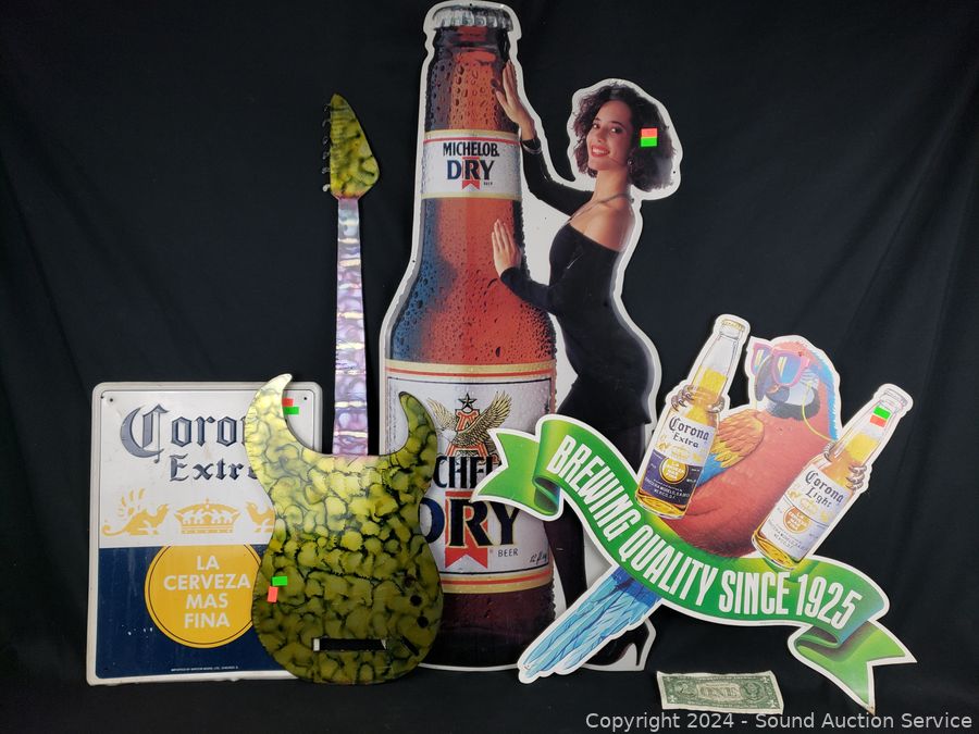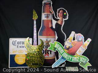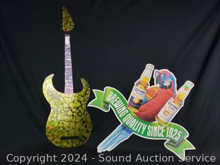 Corona Extra 16" x 12", Corona Light cardboard sign 21" x 21", Michelob Dry 35" x 16", guitar 31" x 10.5".