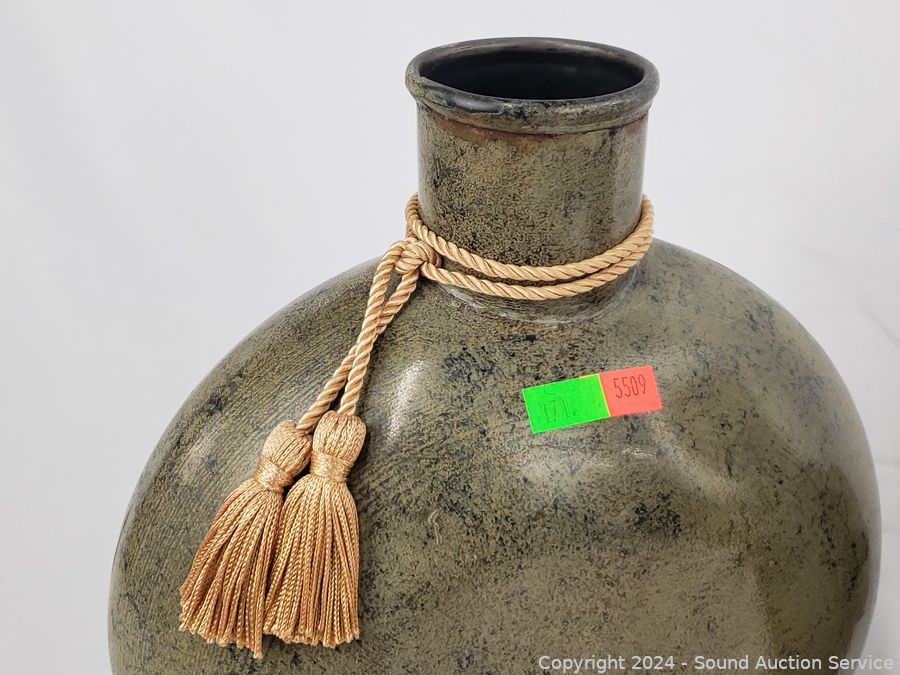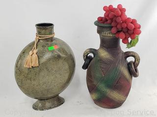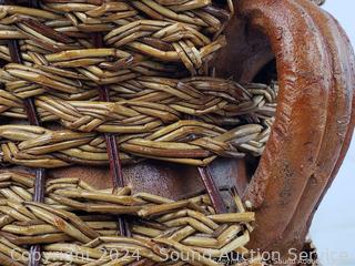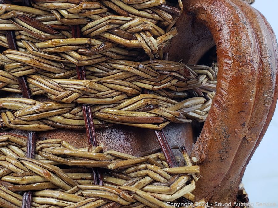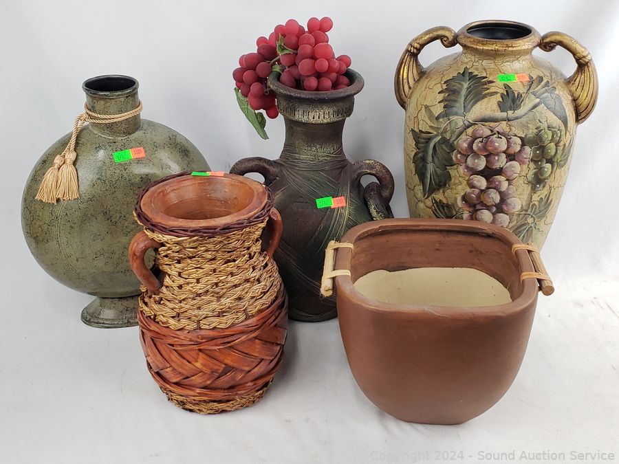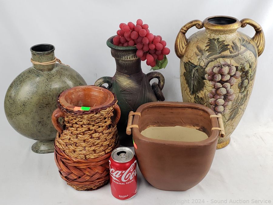 4 Decorate Vases/Pots - Approx. 7" to 15" H x 5" to 9" W/Dia. Woven pot pottery is cracked, damaged.