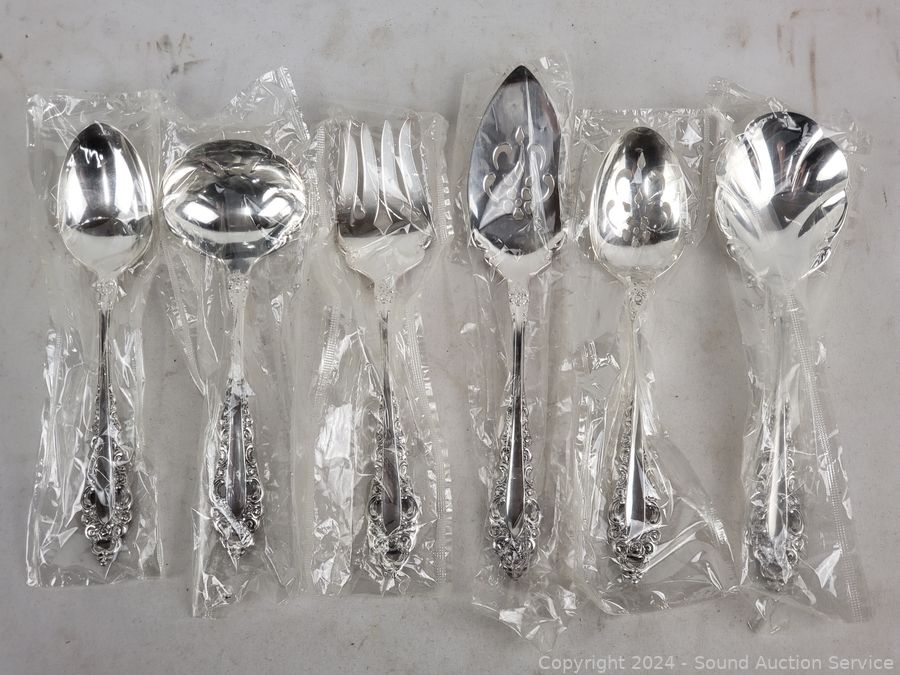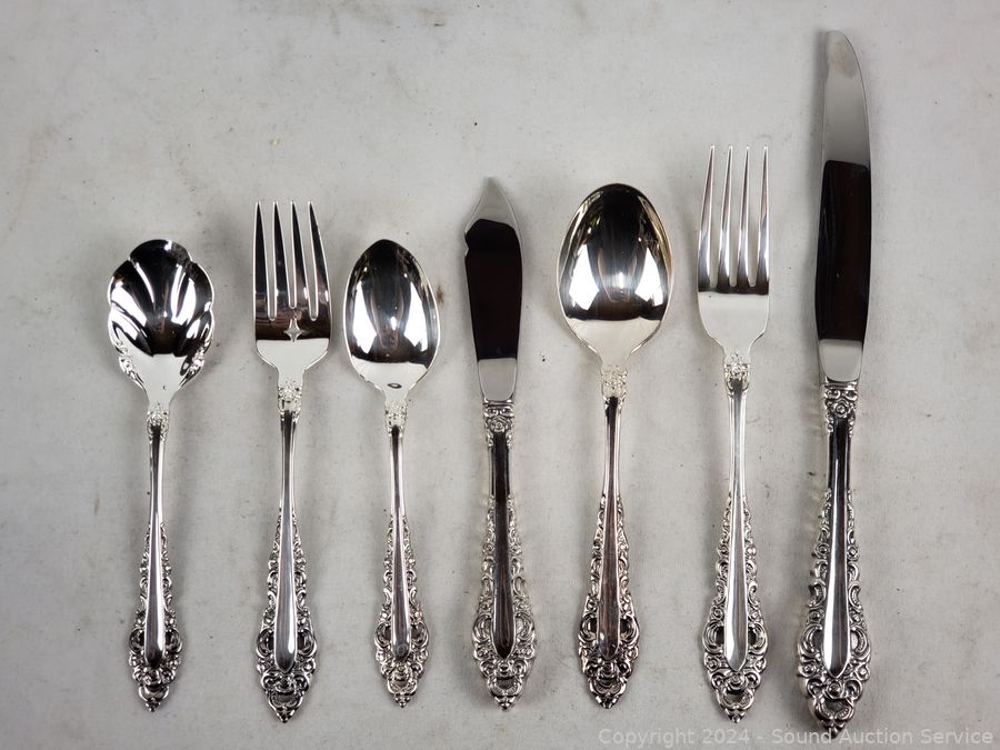 Complete 5pc service for 8 with 8 serving utensils. Comes with chest, all in excellent condition.