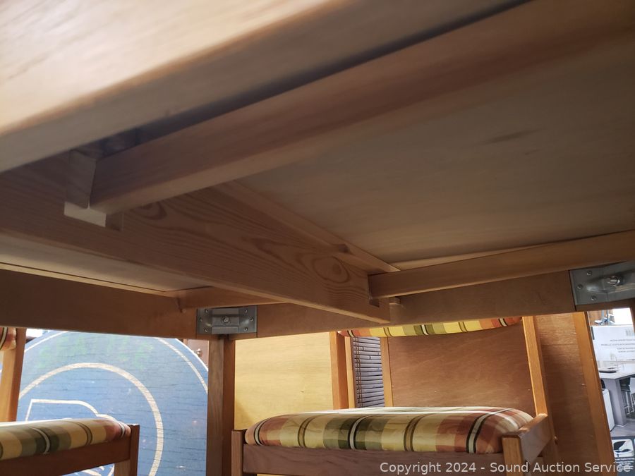 29.5" H x 35.5" x 35.5" table with 2 pullout 15.75" leaves. 30.5" H x 17.5" W x 18" to seat. In great cosmetic condition.