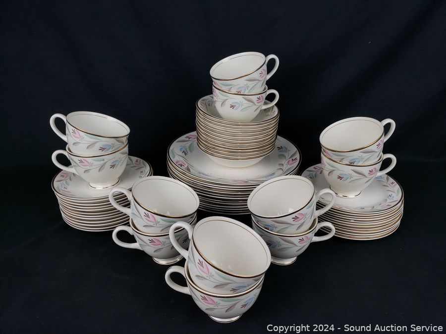 12 Cups, 12 Saucers (see 2 small chips), 12 Dinner Plates, 12 Berry Bowls, 12 Snack Plates. A bit dirty, dusty, could use a proper cleaning. Other than the chips on the saucers, don't see any major issues.