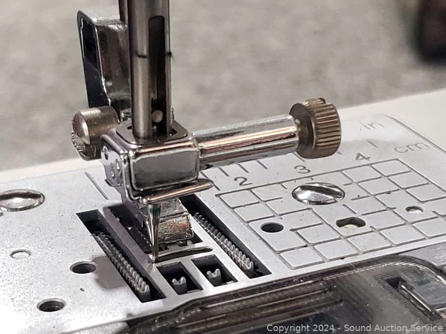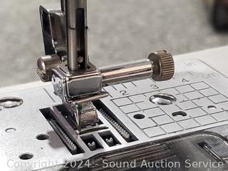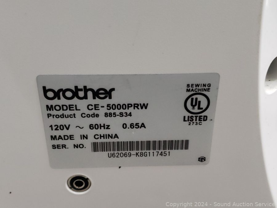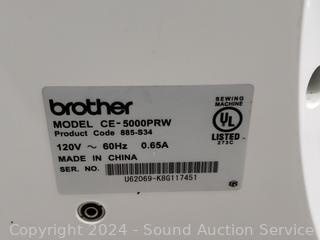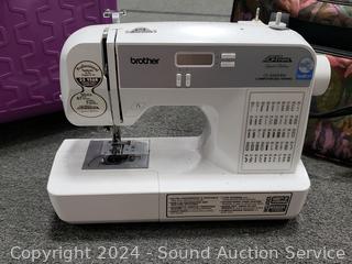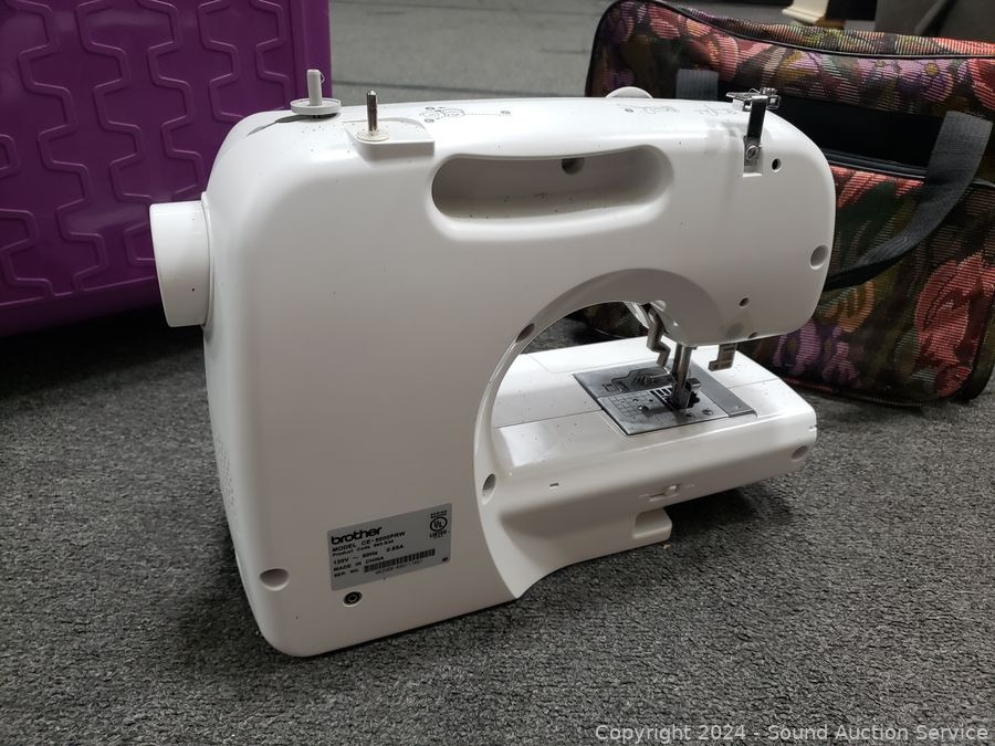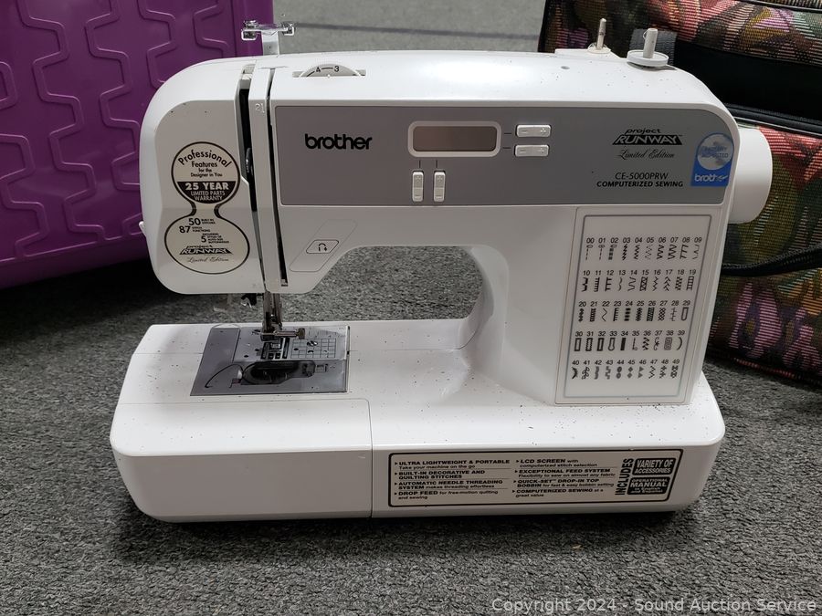 Brother Project Runway CE-5000PRW Computerized Sewing Machine has now power cord, comes with storage case. 4 purses, wear from use, damaged. Suitcase 25" x 17" x 9.5", signs of wear from use.