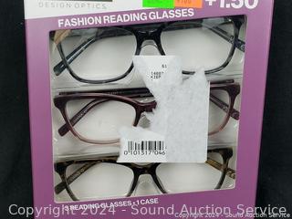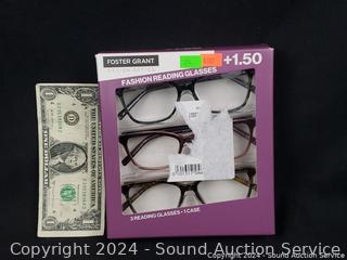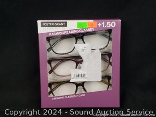 Lot #0186: 3 Foster Grant +1.5 Fashion Reading Glasses w/1 Case