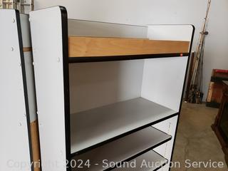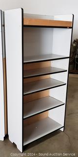 3 of the shelves are adjustable. 66" H x 30.5" W x 14" D. Some light wear to finish, overall great condition.