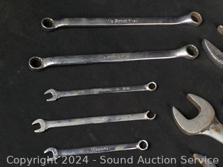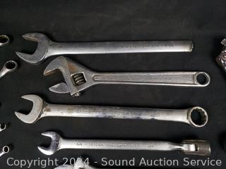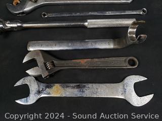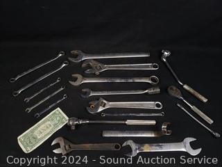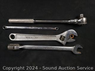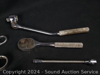 1/2" & 3/8" drive ratchets, 1/4" flex 6" extension, 5/16" to 1-1/4" wrenches, adjustable wrenches. Refer to photos for more details.