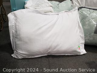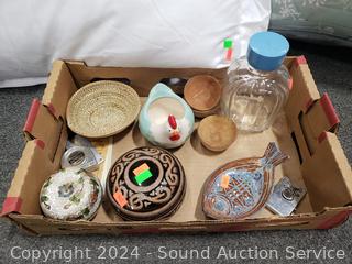 Cloisonné enameled apple trinket box, pottery powder dish, Native wone bowl, pottery fish dish, queen sheets, queen comforter, 4 pillows. ATTN: All items are used, may be missing pieces, damaged, not functioning, complete, no issues, etc. All items as is. Refer to photos for more details.
