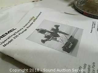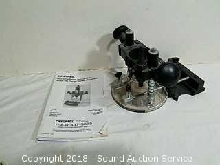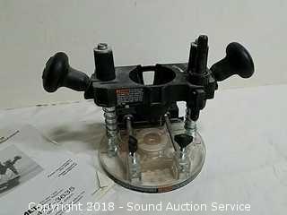 Tool holder is possibly missing some parts. Includes: plunge router attachment, drill press attachment model 220, and shaper router table attachment model 231,