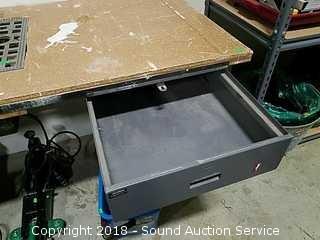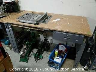 Tabletop is cut out to fit a table saw. Single drawer, adjustable legs, wired with electrical outlets on all 4 legs. Approx. 36" tall, 60" wide and 30" deep.