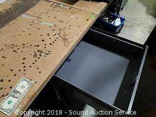 Has two drawers, adjustable height legs, place to mount electrical outlets. Approx. 36" tall, 60" wide and 30" deep.