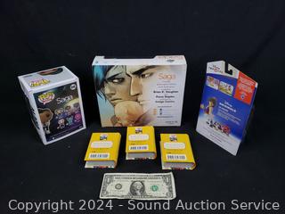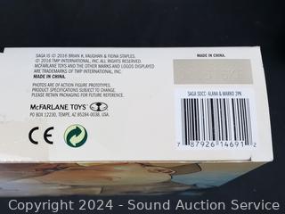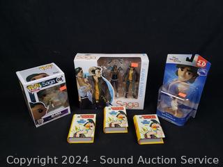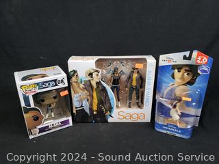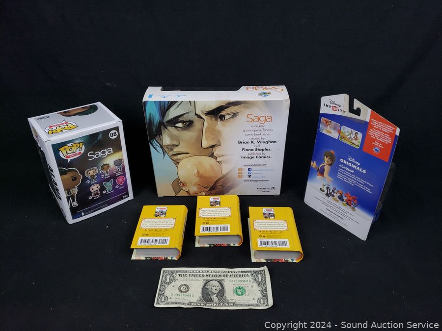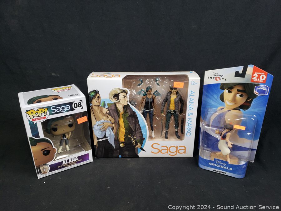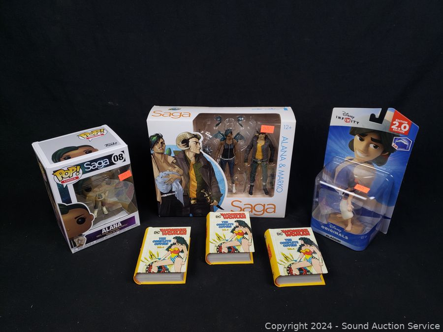 3 Wonder Woman Complete Covers Vol.2, Saga Alana & Marko action figures, Alana Funko Pop!, Disney Infinity Aladdin figure. All appear to be factory sealed.