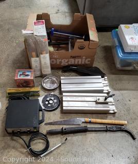300 Lot including Assorted Hardwood Boards, Carving Blocks, Thomas Pradzynski Artist Proof Silkscreen, Various Wood Tools, Garantie E.C.E. West Germany Wood Block Planes, Lathe Turning Tools, Power Tools, Mandolin, Spotting Scope, Anvil, Bedding, Personal Hygiene Products, Leatherman Tools, Air mattresses, Water Ski's, Snowboards, Inflatable Boats, Cosmetics, Action Figures, Household Goods, Camping Supplies, Artificial Christmas Tree's & Much More!!!