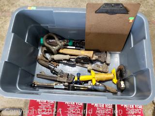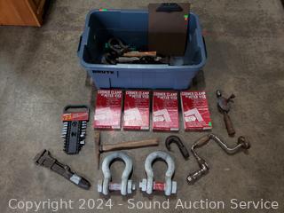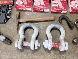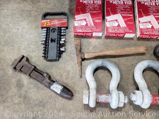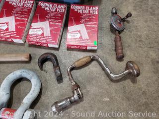 8" Crosby clevises, corner clamps, sockets, brace, hand drills, pipe wrenches, hammers, wrenches, etc. Refer to photos for more details.
