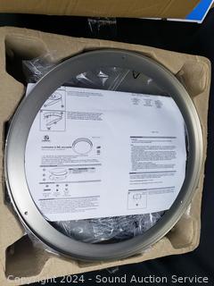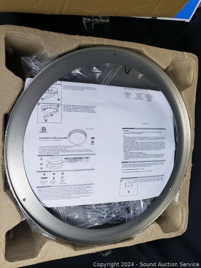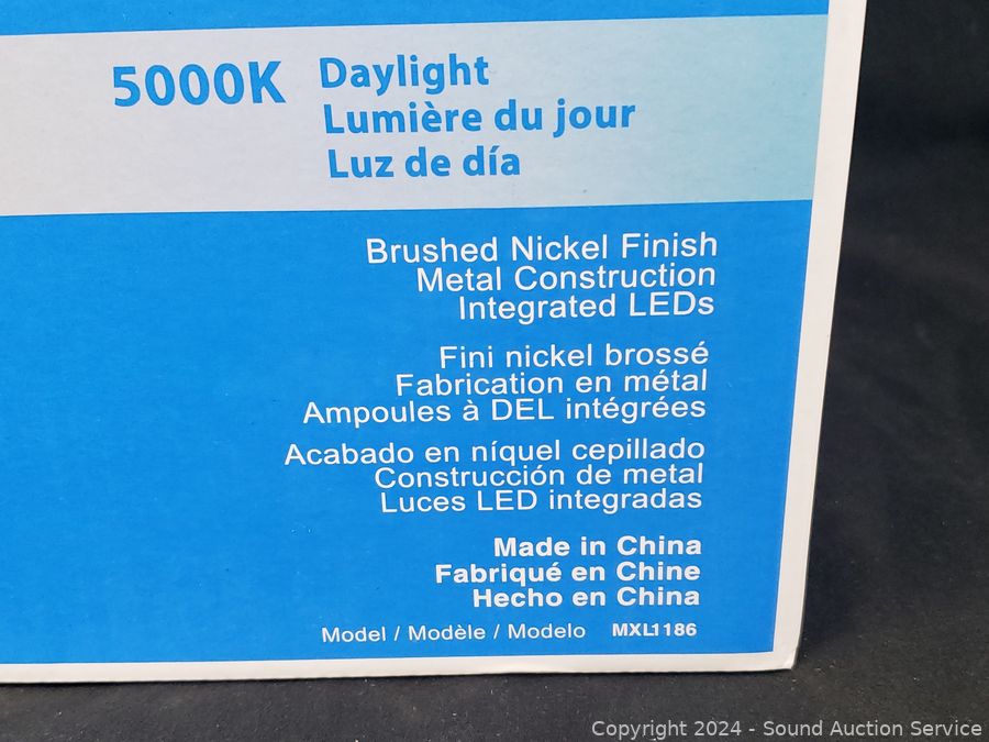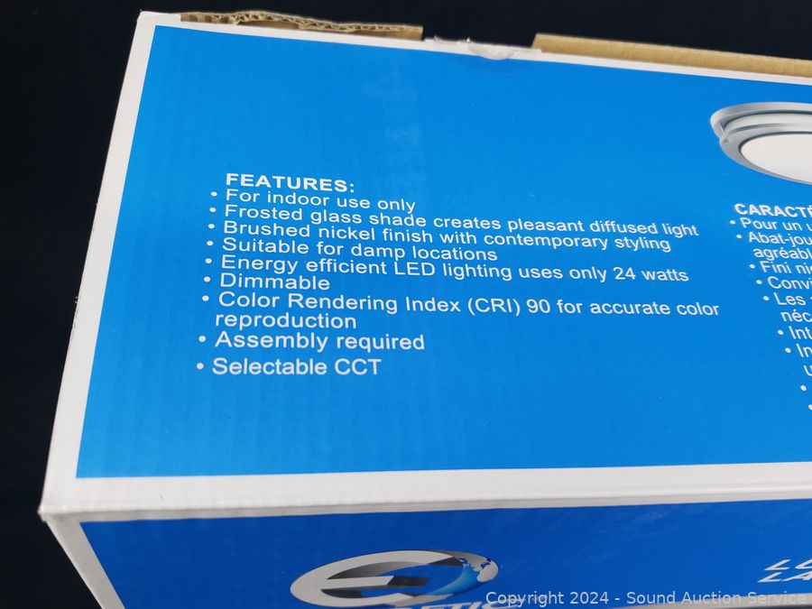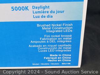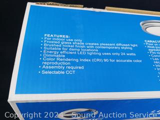 Brushed nickel finish, frosted glass lens, integrated LED's. 24W, 1560LM, 3000-5000K color. Appears to be functioning as intended, complete.