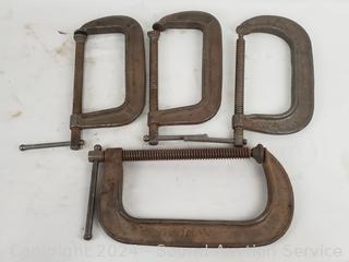 "C" clamps, Craftsman corner frame clamps, Bessey clamps, spring clamps, Keller & Co. dovetail clamps kit.