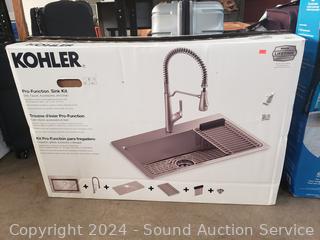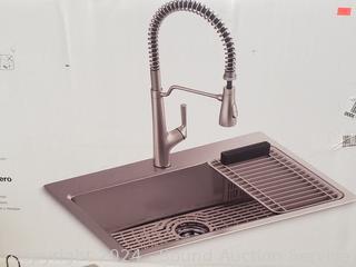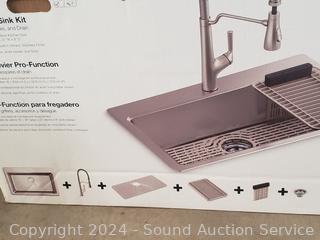 18GA Stainless Steel 33" L x 22" W x 9" D Single Bowl Kitchen Sink, Semi Professional Pulldown Kitchen Faucet, Silicone Sink Mat, Drying Rack, Knife Holder, Drain. Appears complete, don't see any issues. #1667833.