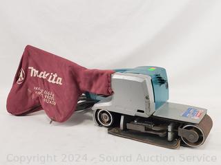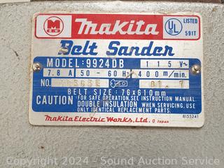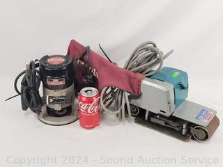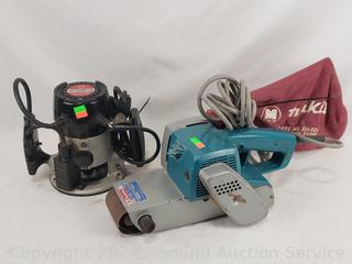 Makita Belt Sander Model 9924DB, Router Model 315.17480. Both appear to be functioning as intended. Signs of wear from use.
