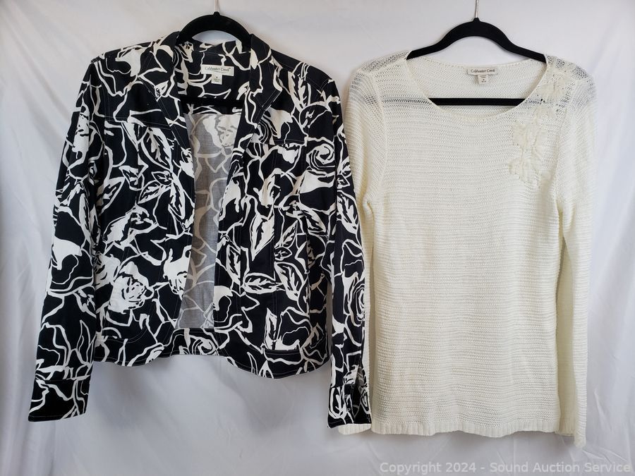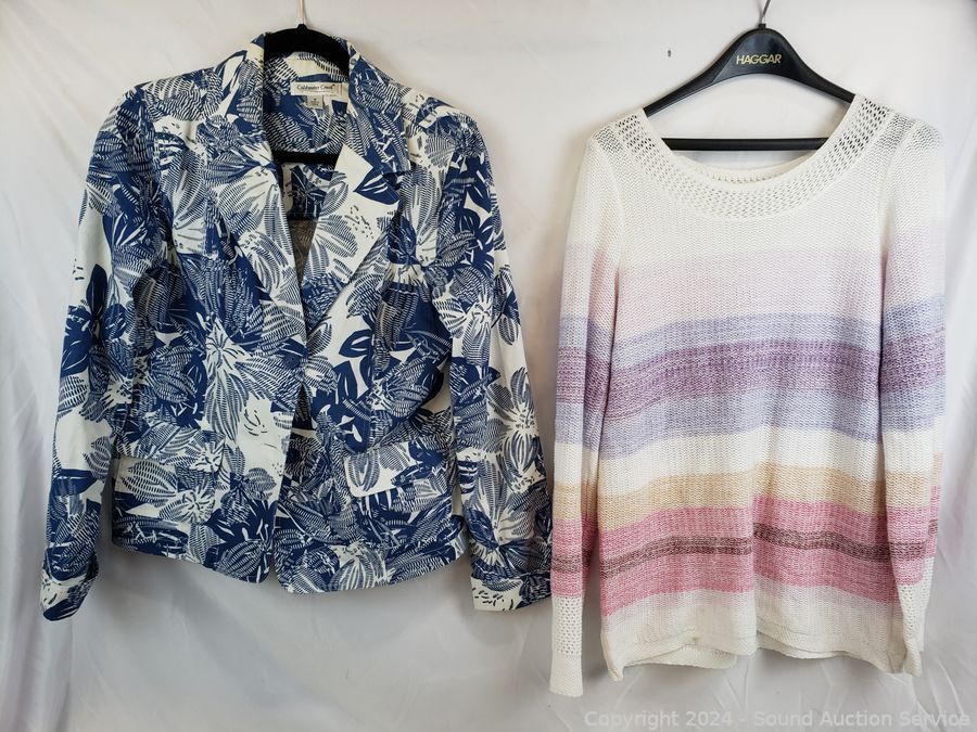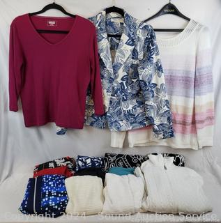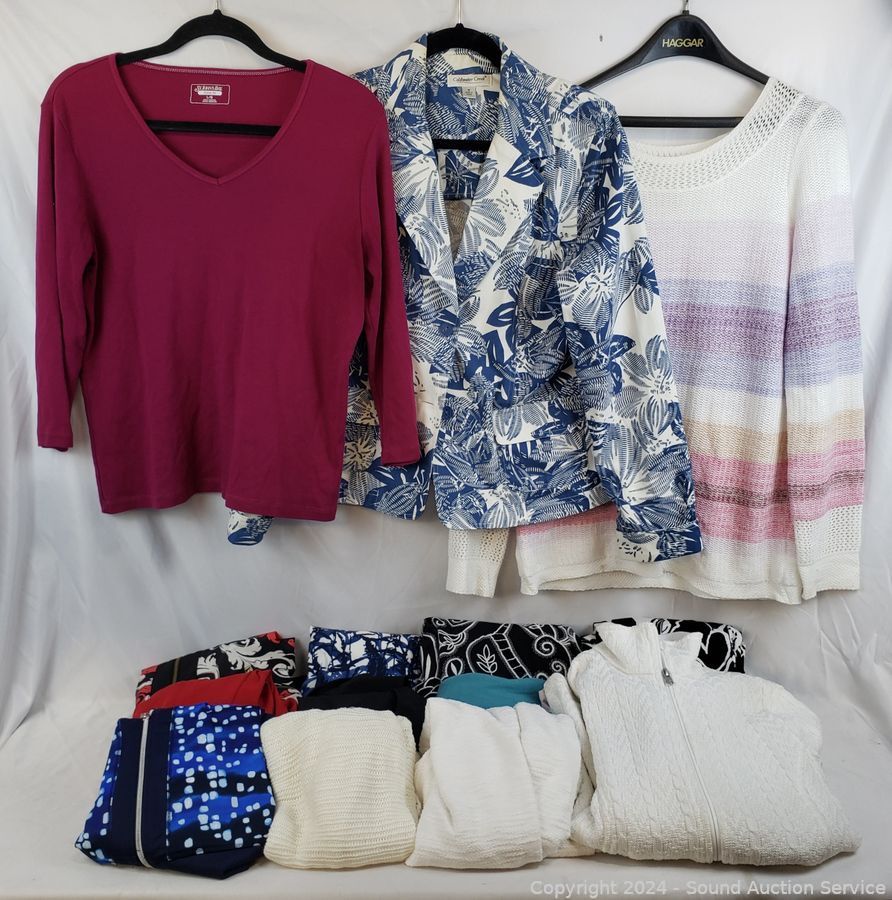 Sweaters, shirts, tops, skirts, etc. Tote with lid included 16" H x 22" x 17". Refer to photos for more details.