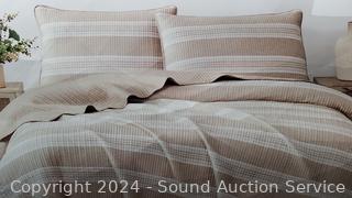 1 quilted coverlet 106" x 100", 2 quilted shams 20" x 36". Some minor loose threads.