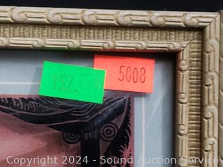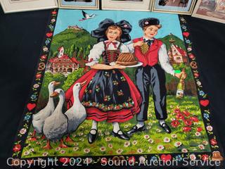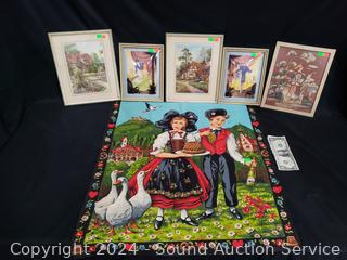 Lot #0152: 5pc Vtg. Litho Artwork & Alsace Folk Art Tapestry/Towel
