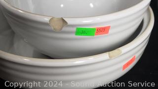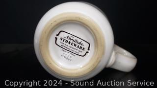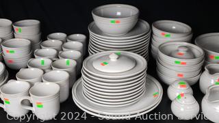 (12) Mugs, (10) 4.75" bowls, (10) salad plates, (12) dinner plates, (9) 6.5" bowls, salt/pepper, (2) gravy boats, creamer, tea/coffee pot, (2) 9.5" bowls, (2) 12" chargers, (2) 7.75" bowls (1 is chipped), (1) 9.5" Bowl (has a chip).
