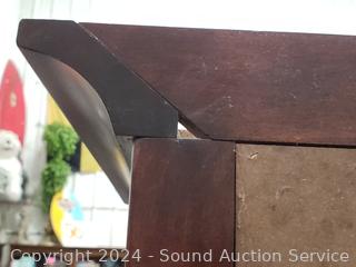 Built in power supply. Appears to be all wood construction. Missing dowel on one side that sits on top. 77" H x 46" to 51" W x 24" to 26" D.