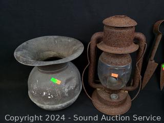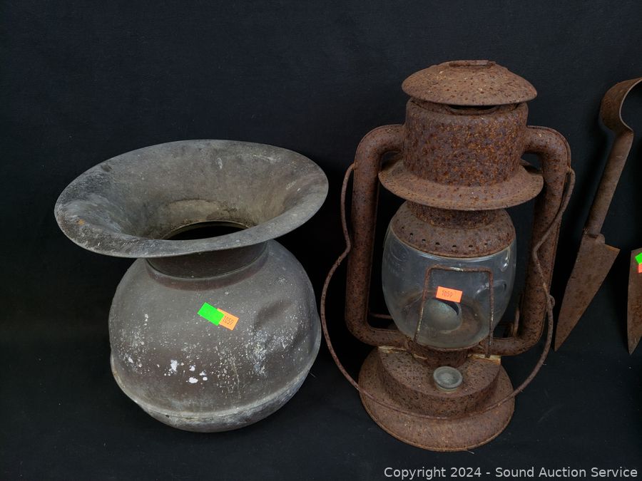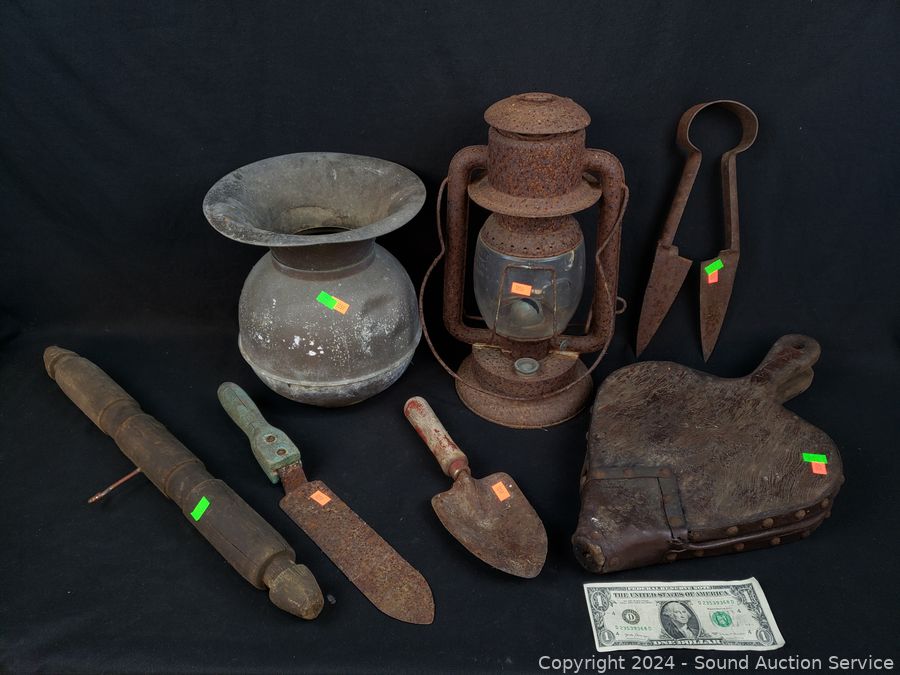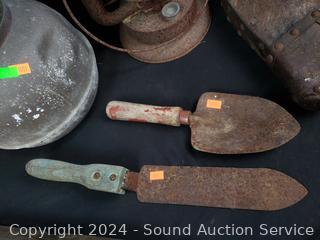 Shears, hand shovel, spittoon, oil lamp, billows. Various rust, wear to finish, refer to photos for lot contents, more details.