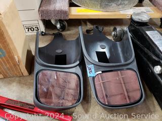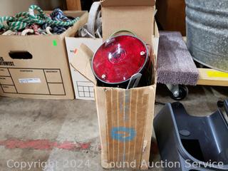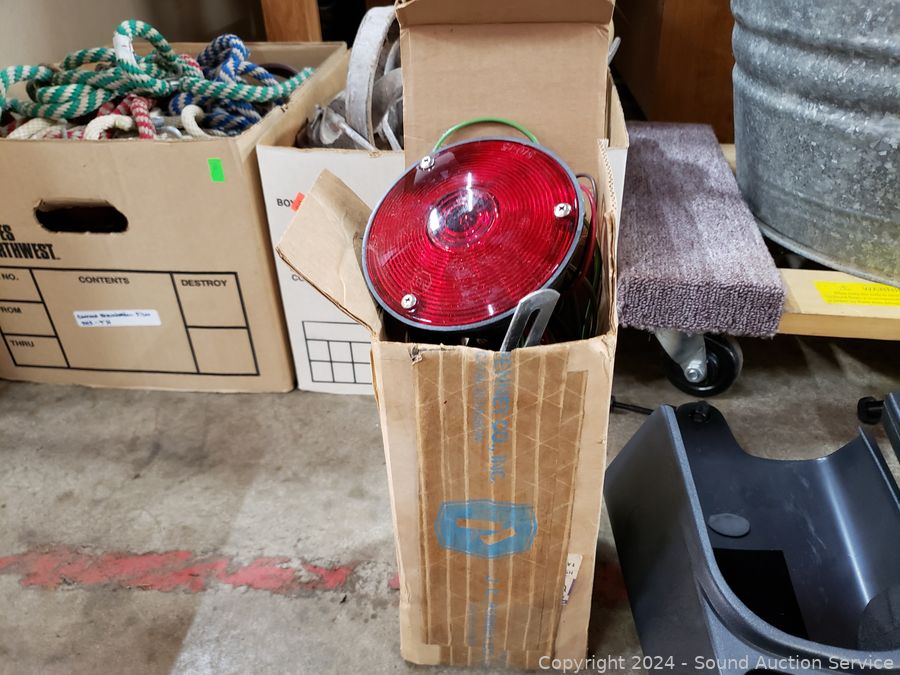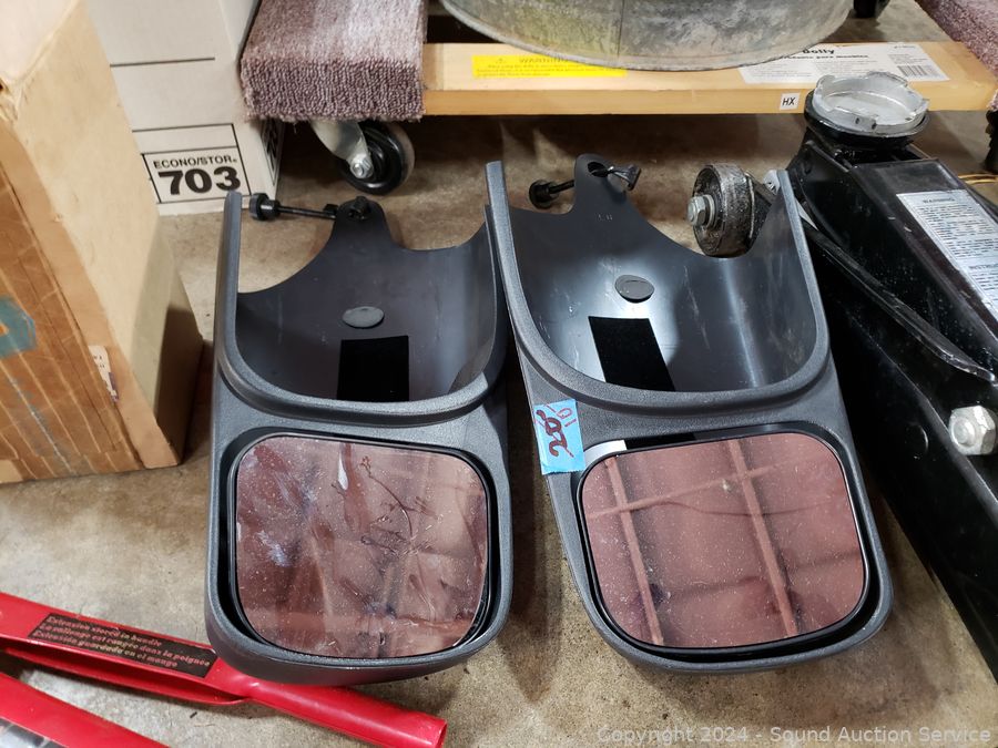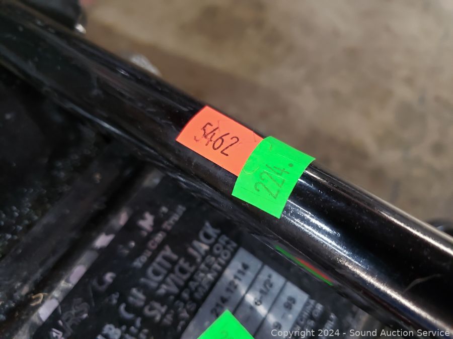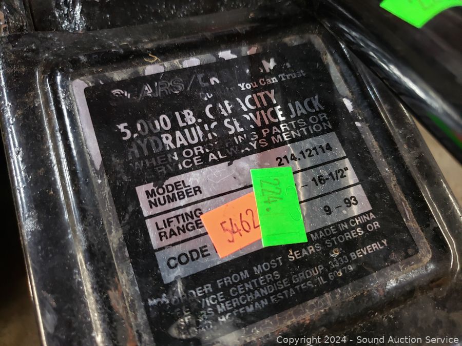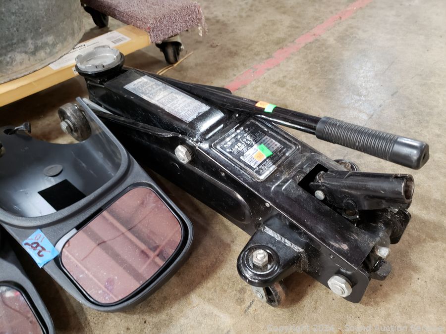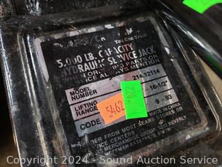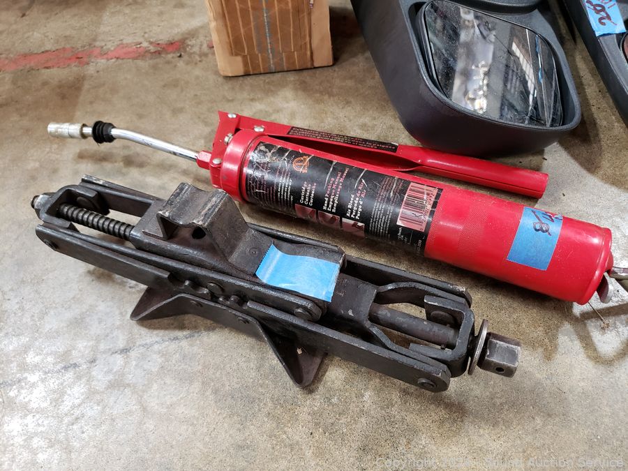 5000LB Hydraulic Floor Jack, signs of wear from use, appear to be functioning as intended. Scissor jack, grease gun, 2 Ford? side mirror extensions, trailer/towing lights.