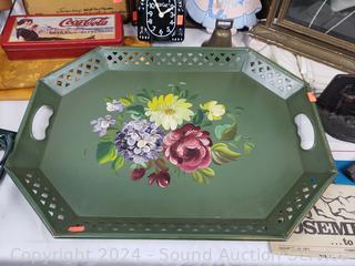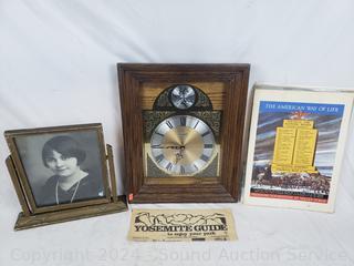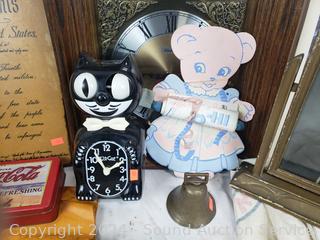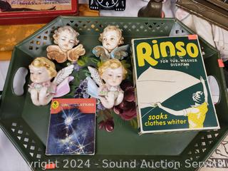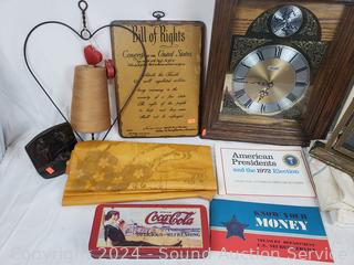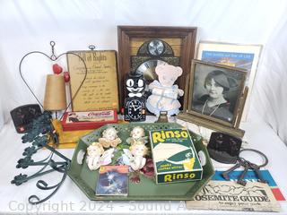 Rinso granulated soap, spool of thread, painted silk, cloth bags, Coca-Cola tin, Cat clock (not functioning), cherubs, portrait, wall clock & more. Refer to photos for more details.
