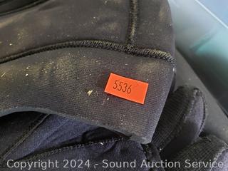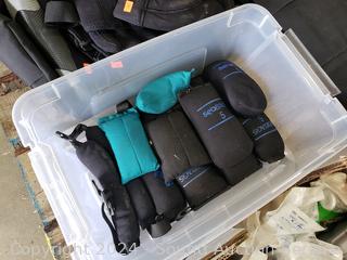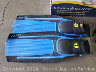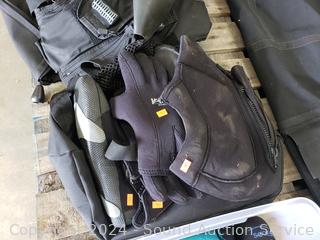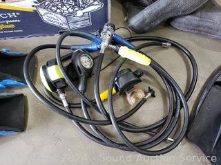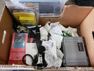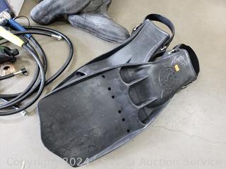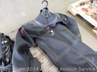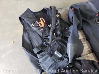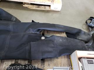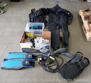 Seabag weights, fins, respirators, tank vest S:L, gloves S:L, Hood S:M, Booties S:10, Dive Rite 905 dry suit (I cannot find a size but it is for a large person, it's taller than I am at 5'7"), pelican case, diving VHS tapes & more.