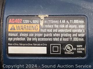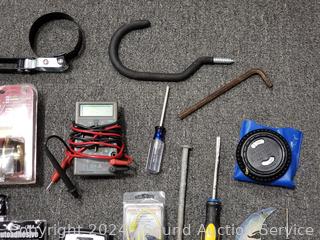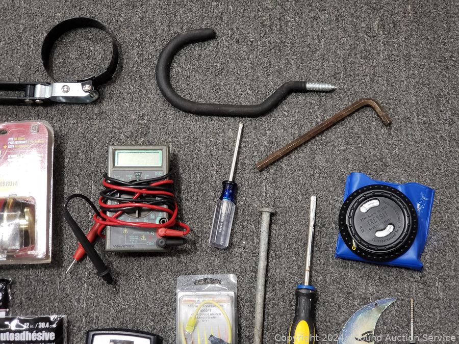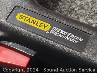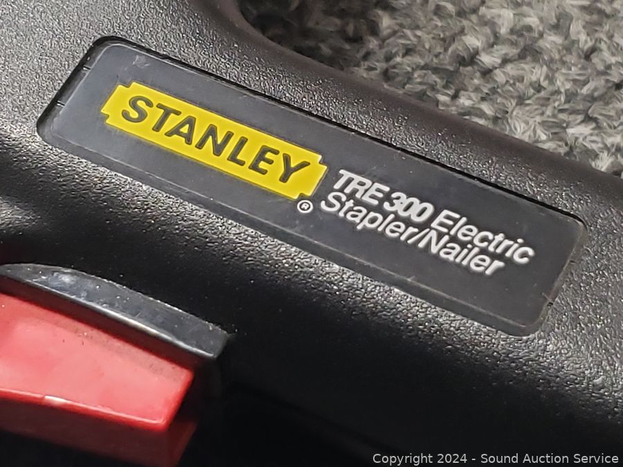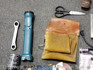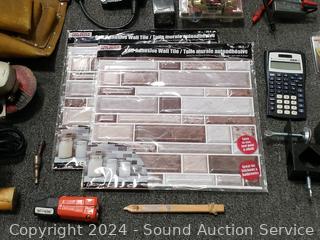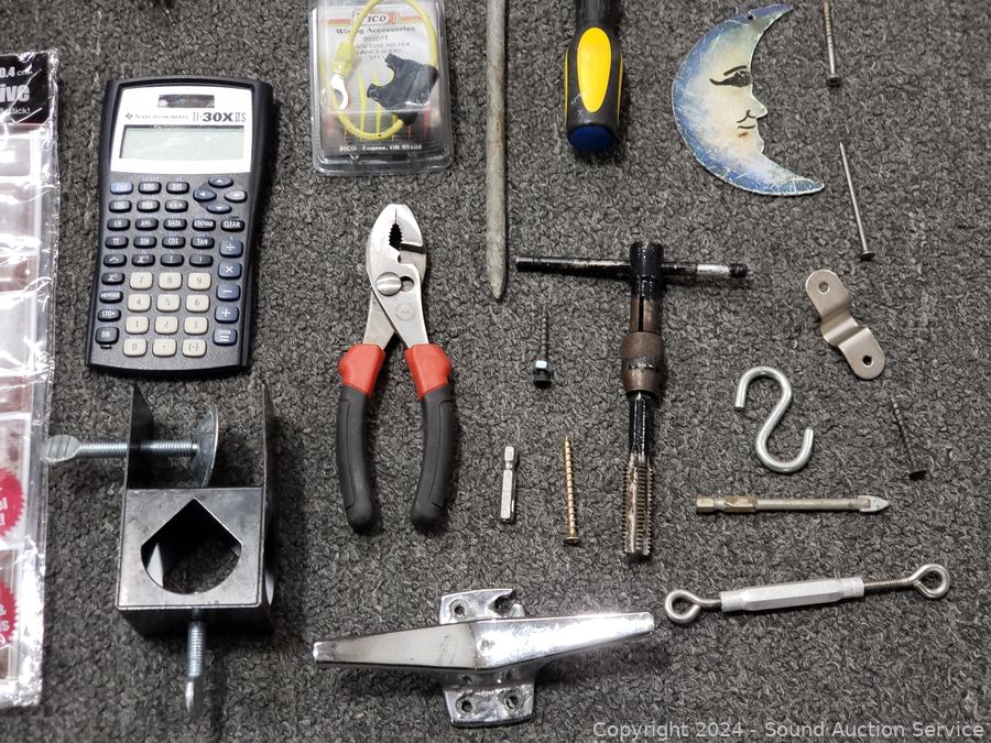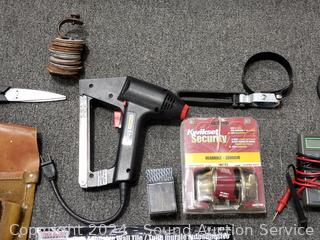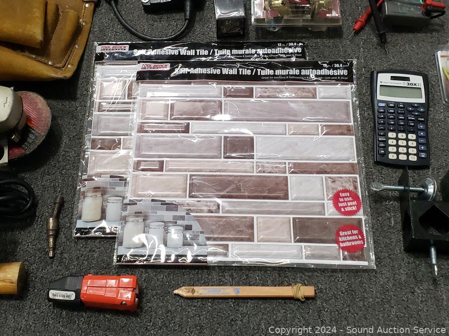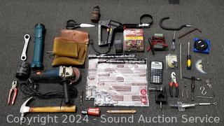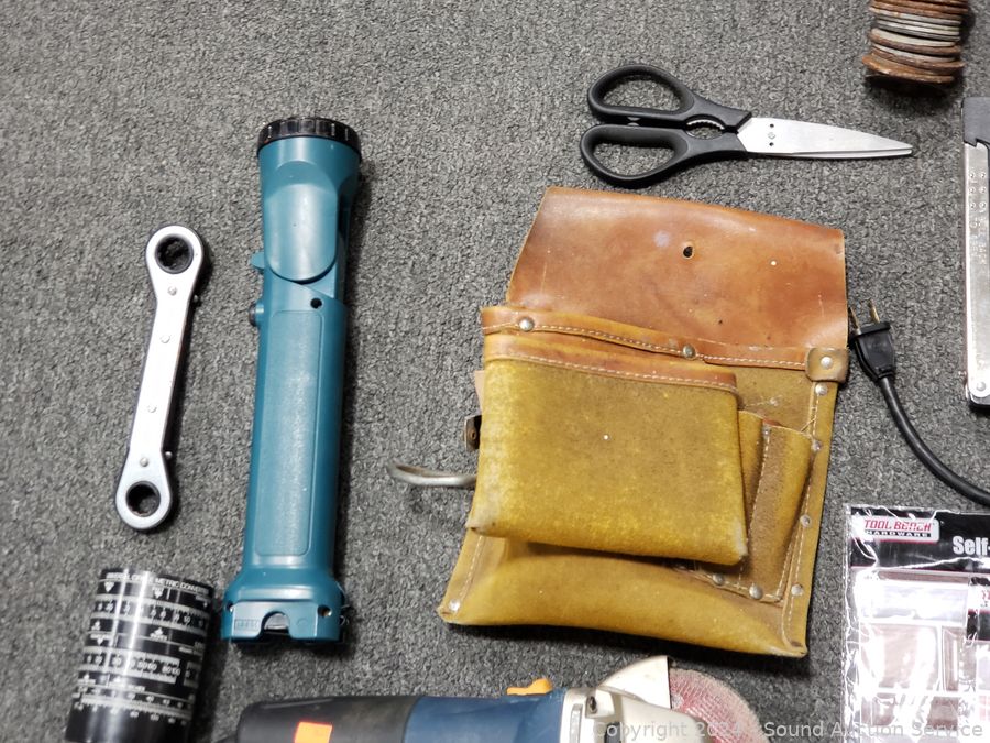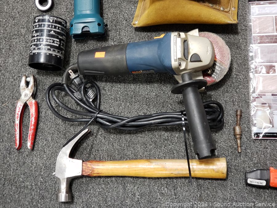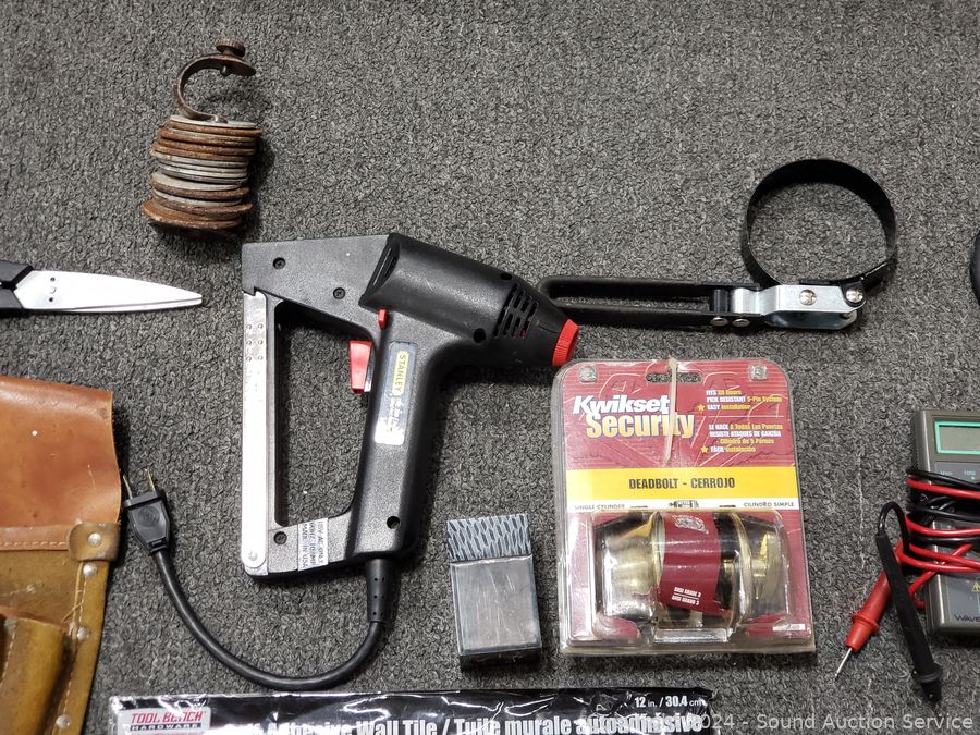 Ryobi Angle grinder, Elec. Stanley staple gun, leather tool bag, Texas Instrument TI-30X scientific calculator, multi-meter, adhesive tiles. Grinder & staple gun appear to be functioning as intended.
