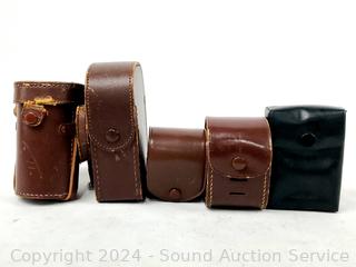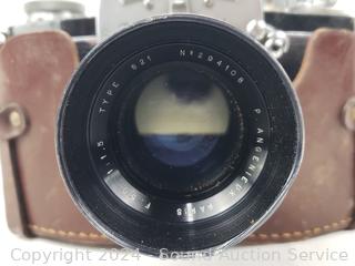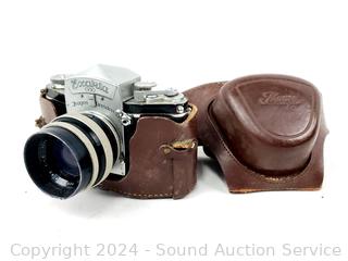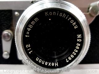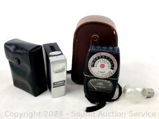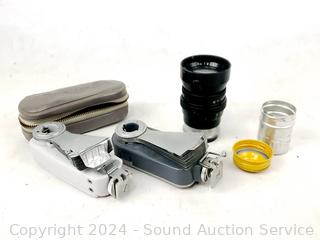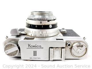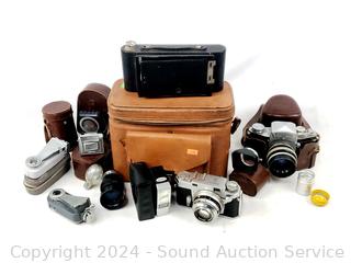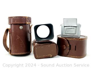 Konica III Camera, Koniflash, f=135mm 4.5 lens, exposure meter, Canonlite flash, Exakta VX camera w/leather case, Kodak 116 camera case parts/repair.
