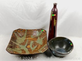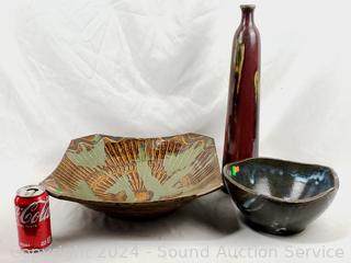 Lot #0078: 3pc Pottery Vase, Bowl & Centerpiece Bowl